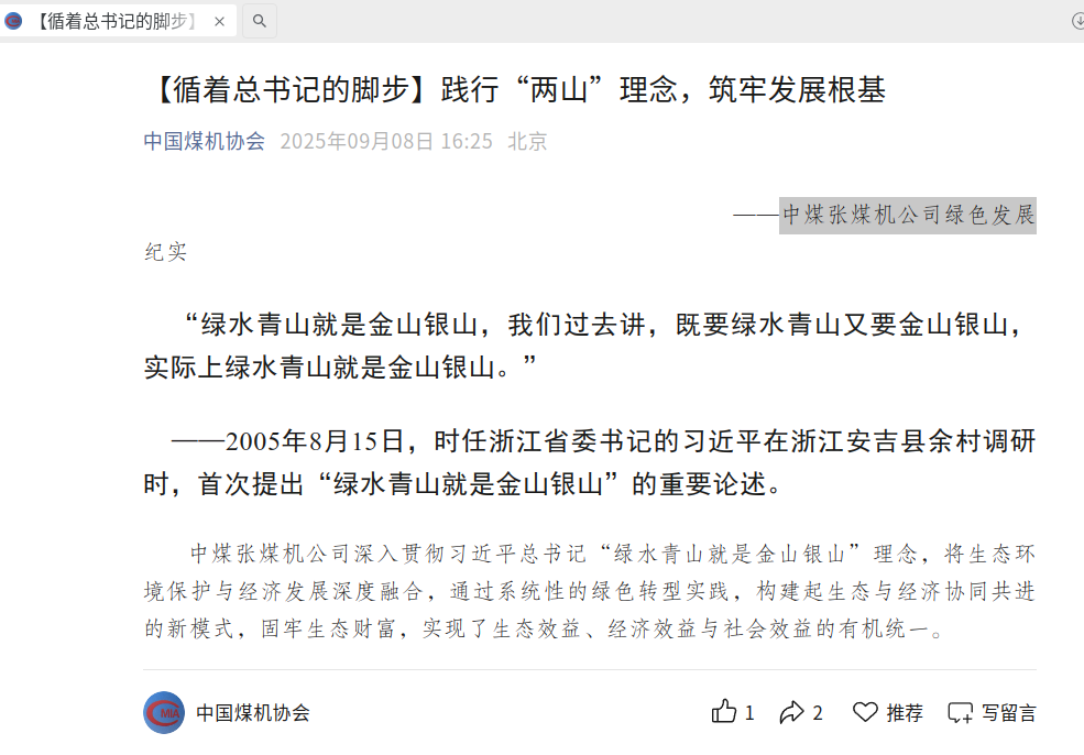 中國煤機協會公眾號——【循著總書記的腳步】踐行“兩山”理念,筑牢發展根基-中煤張煤機公司綠色發展